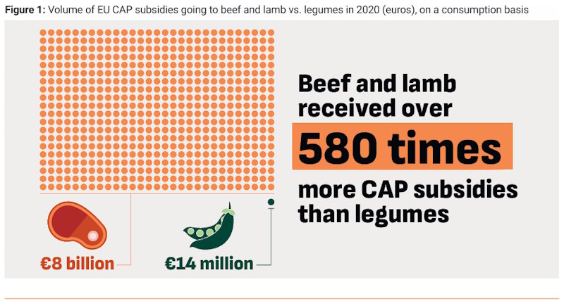 In 2020 heeft de Europese Unie ongeveer 8 miljard euro aan middelen van het Gemeenschappelijk Landbouwbeleid (GLB) toegewezen aan de productie van rundvlees en schapenvlees met een hoge uitstoot. Slechts 14 miljoen ging naar peulvruchten – zoals linzen en bonen, dus 580 keer meer voor vlees en lamsvlees dan voor plantaardige eiwitten met een lage impact.