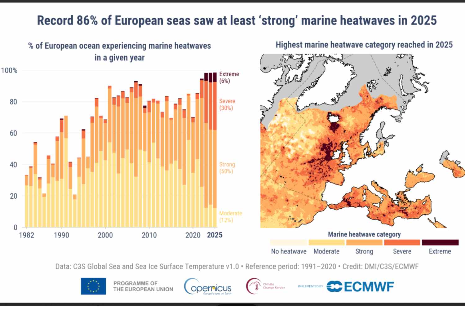 Ondertussen heeft de gemiddelde jaarlijkse temperatuur van het zeewateroppervlak in Europa de hoogste ooit gemeten waarde bereikt: het vierde opeenvolgende recordjaar. 86% van het oceaangebied heeft minstens één “ernstige” hittegolf op zee meegemaakt; 36% bereikte een ‘ernstig’ of ‘extreem’ niveau, ook een recordpercentage. De Middellandse Zee is voor het derde achtereenvolgende jaar getroffen door ten minste één episode van een hittegolf op zee. De posidoniaweiden, van fundamenteel belang voor het kustecosysteem, dragen de directe gevolgen.