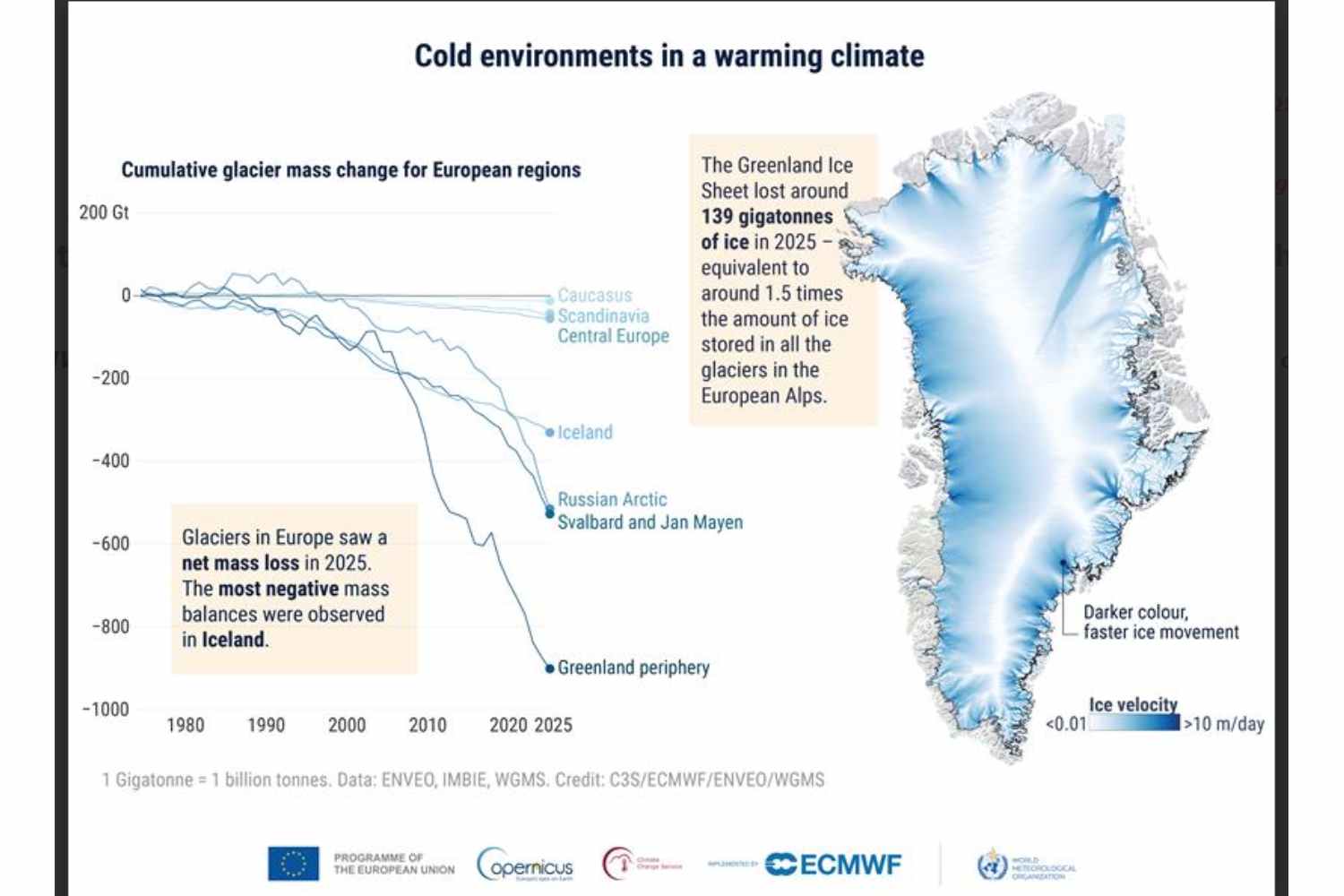 De Europese gletsjers hebben in alle regio’s massa verloren. IJsland boekte zijn op een na grootste verlies sinds 1976: alleen in het jaar van de uitbarsting van de Eyjafjallajökull in 2010 was het slechter gegaan. Groenland verloor 139 gigaton ijs, ongeveer anderhalf keer het totale volume van alle gletsjers in de Europese Alpen, waardoor de zeespiegel alleen al met 0,4 mm in een jaar tijd steeg. Voor elke centimeter stijging worden zes miljoen mensen extra blootgesteld aan het risico van kustoverstromingen. De sneeuwbedekking in Europa was in maart 31% lager dan gemiddeld: een gebied gelijk aan Frankrijk, Italië, Duitsland, Zwitserland en Oostenrijk samen was sneeuwvrij.